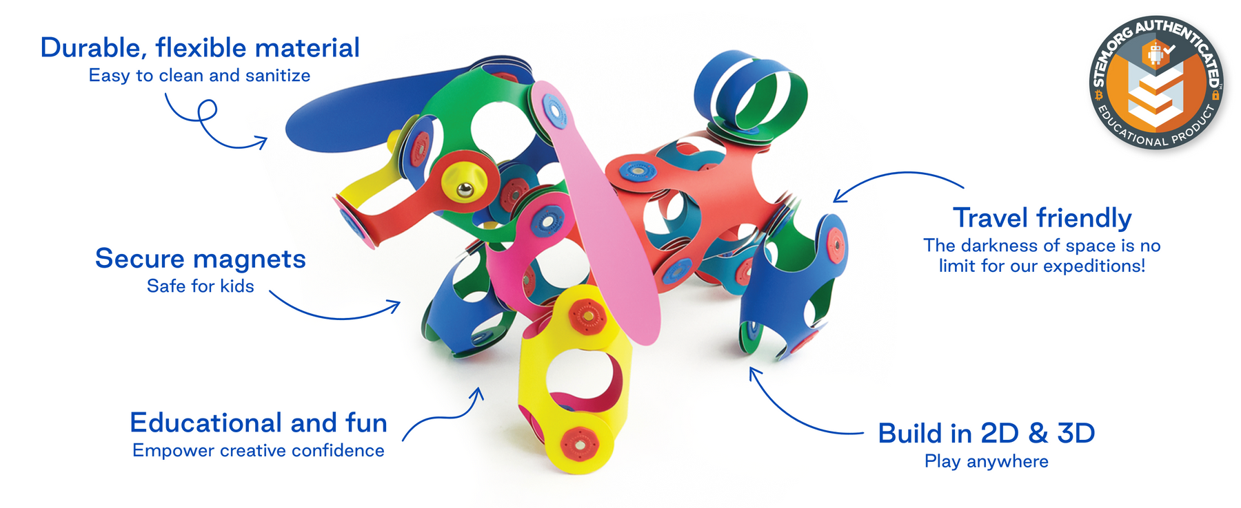 It’s easy and simple! Connect different shapes and pieces together by snapping the red and blue magnets together. The pieces are also flexible and can be curved differently to make different designs.