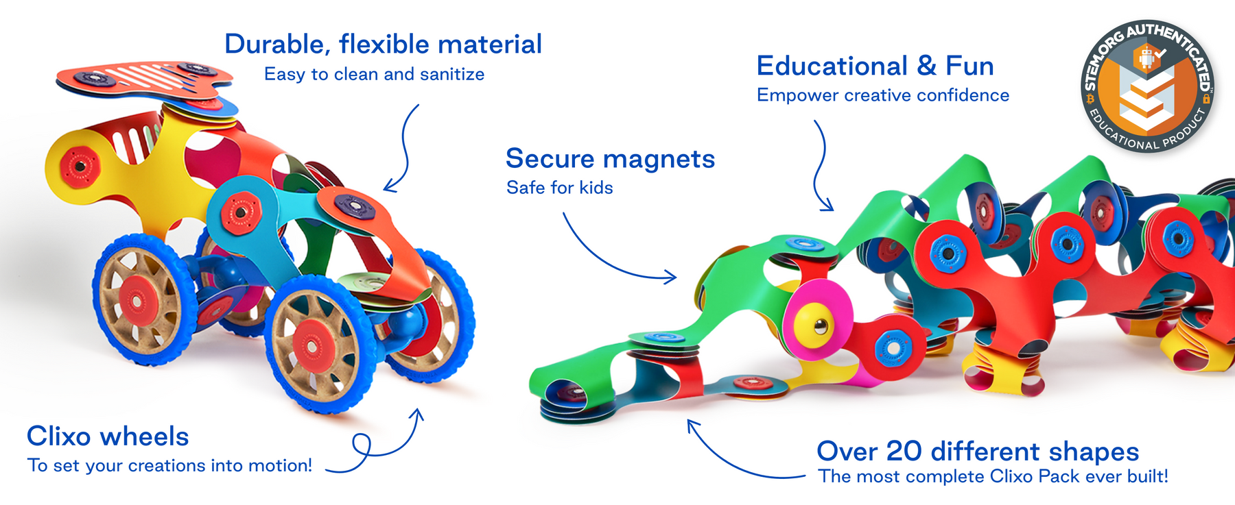 Clixo pieces are for anyone 4 to 99! Children and adults of all ages love them and use them for playing, prototyping, or as a fun, fidgety desk toy!
