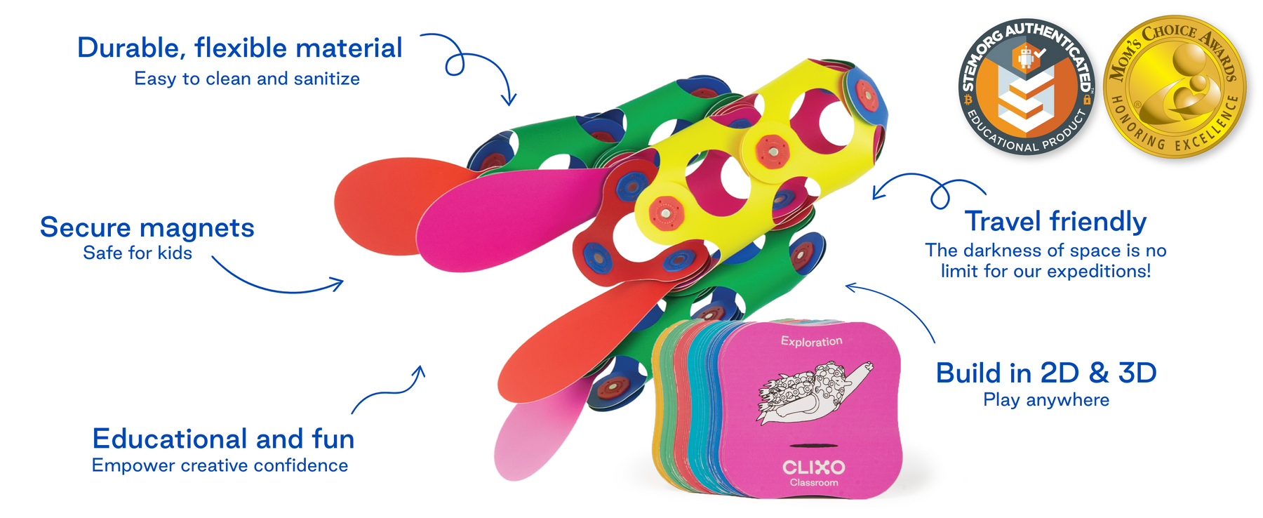 Clixo pieces are made from recyclable and durable synthetic paper with strong-embedded magnets for maximum safety. The materials are proprietary, kid-safe (non-toxic), and specially developed for our brand. Safety is a priority for Clixo, and all Clixo products have passed numerous laboratory tests and are compliant with federal toy safety standards, including ASTM, EN71, and California’s Proposition 65. Our packaging is made from recycled bamboo and is sustainably manufactured.