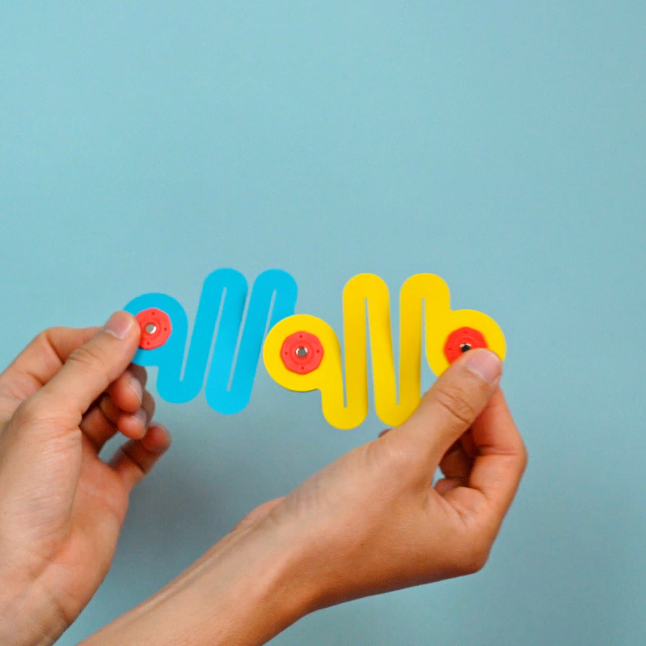 It’s easy and simple! Connect different shapes and pieces together by snapping the red and blue magnets together. The pieces are also flexible and can be curved differently to make different designs.