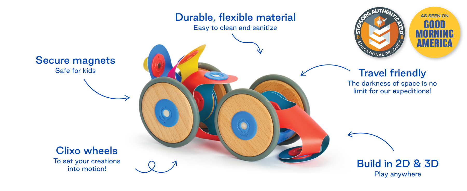 Through its ingenious, research-based design, Clixo enables kids to learn science, spatial, and tactile skills from turning flat 2D shapes into 3D objects. The pieces also encourage experimentation, enabling kids to turn abstract concepts and creative ideas into tangible reality. Elements in the design also involve certain constraints, which help foster soft skills like creative thinking, patience, and persistence.
